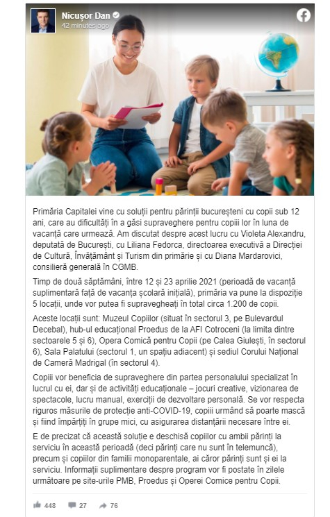 „E de precizat că această soluție e deschisă copiilor cu ambii părinți la serviciu în această perioadă (deci părinți care nu sunt în telemuncă), precum și copiilor din familii monoparentale, ai căror părinți sunt și ei la serviciu. Informații suplimentare despre program vor fi postate în zilele următoare pe site-urile PMB, Proedus și Operei Comice pentru Copii”.