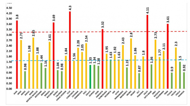Au depășit pragul de 3 cazuri COVID la mia de locuitori, în ultimele 14 zile, și următoarele județele: Alba (3,8), București (3,69), Harghita (3,32), Sălaj (3,43) și Timiș (3,61).