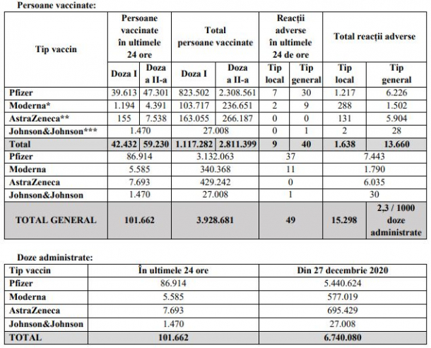Comitetul Național de Coordonare a Activităților privind Vaccinarea împotriva COVID-19 (CNCAV) a anunțat că, în ultima zi, au fost vaccinate 101.662 de persoane, fiind înregistrate 49 de reacții adverse. Numărul total al celor vaccinați a ajuns la 3.928.681, din care 2.811.399 au schema de imunizare completă. 15.298 de reacții adverse s-au înregistrat de la debutul campaniei.