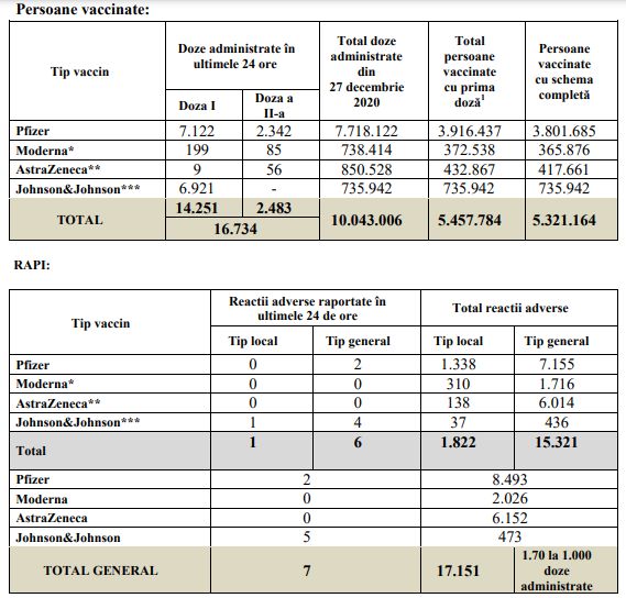 5.457.784 de persoane au fost vaccinate anticoronavirus în total, din care 5.321.164 au schema de imunizare completă.