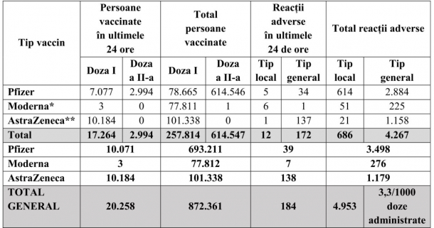 De la debutul campaniei de vaccinare, în țara noastră au fost imunizate 872.361 persoane, fiind folosite 1.486.907 doze de vaccine.