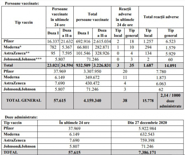 Puțin peste 57.600 de români au fost vaccinați anticoronavirus în ultima zi, arată noile date publicate de Comitetul Național de Coordonare a Activităților privind Vaccinarea împotriva COVID-19 (CNCAV). Au fost raportate doar 38 de reacții adverse. De la debutul campaniei de imunizare au fost vaccinate peste 4,1 milioane de persoane, fiind raportate aproape 15.800 de reacții adverse.