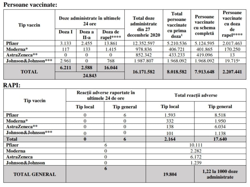 Potrivit CNCAV, de la începutul campaniei de vaccinare, în 27 decembrie 2020, au fost administrate 16.171.582 doze de vaccin pentru 8.018.582 de persoane, 7.913.648 primind schema completă şi 2.207.441 imunizându-se cu doza a treia, conform Agerpres.