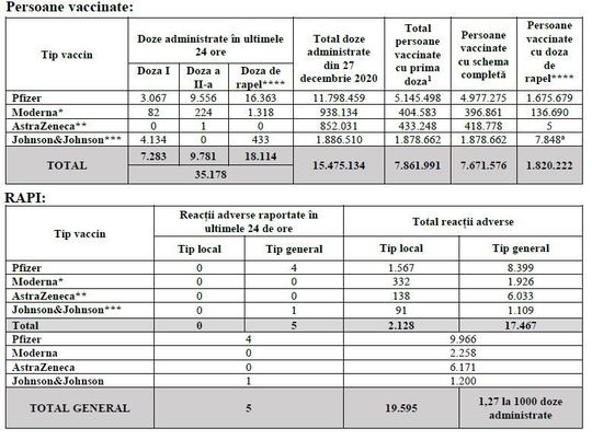 În total, de la debutul campaniei de vaccinare, în România au fost imunizate un număr de 7.861.991 persoane, iar 7.671.576 au primit schema completă. De asemenea, 1.820.222 de persoane au fost vaccinate cu doza a treia.