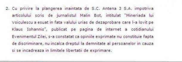 „Cu privire la plangerea inaintata de S.C. Antena 3 S.A. impotriva articolului scris de jurnalistul Malin Bot, intitulat “Mineriada lui Voiculescu a esuat in fata valului urias de dezaprobare care l-a lovit pe Klaus Iohannis”, publicat pe pagina de internet a cotidianului Evenimentul Zilei, s-a constatat ca opiniile exprimate nu constituie fapta de discriminare, nu incalca dreptul la demnitate al persoanelor in cauza si se incadreaza in limitele libertatii de exprimare. Vot: in unanimitate a celor prezenti (8 voturi).