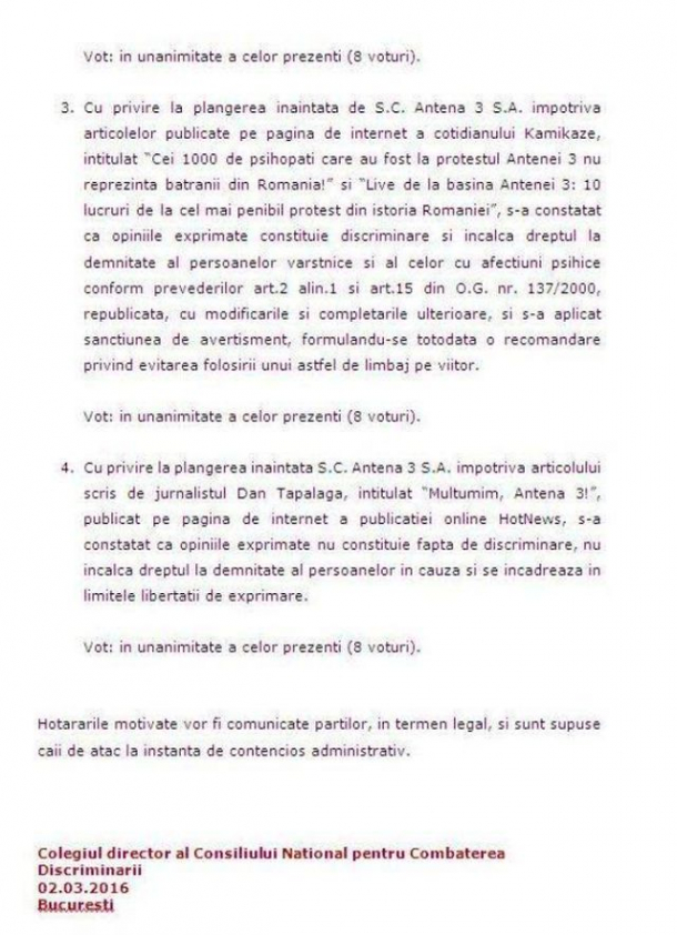 Cu privire la plangerea inaintata S.C. Antena 3 S.A. impotriva articolului scris de jurnalistul Dan Tapalaga, intitulat “Multumim, Antena 3!”, publicat pe pagina de internet a publicatiei online HotNews, s-a constatat ca opiniile exprimate nu constituie fapta de discriminare, nu incalca dreptul la demnitate al persoanelor in cauza si se incadreaza in limitele libertatii de exprimare. Vot: in unanimitate a celor prezenti (8 voturi)”, precizează CNCD într-un comunicat de presă postat pe Facebook de jurnalistul Mălin Bot.