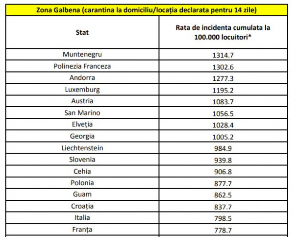 Vineri, Comitetul Național pentru Situații de Urgență (CNSU) a anunțat că a adoptat în ședință Hotărârea cu numărul 55, prin care a fost actualizată lista țărilor și zonelor de risc epidemiologic. Persoanele care ajung în România din aceste teritorii vor trebui să stea în carantină 14 zile, la domiciliu sau într-o altă locație declarată.