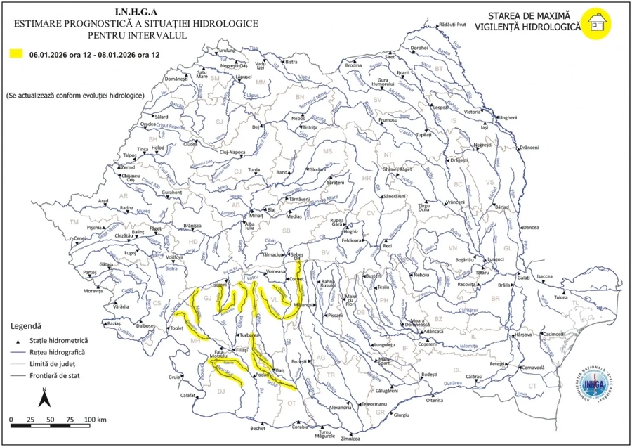 Potrivit prognozei de specialitate, în intervalul 6 ianuarie, ora 12:00 – 8 ianuarie, ora 12:00, sunt așteptate viituri rapide și creșteri semnificative ale debitelor. Fenomenele sunt prognozate pe mai multe cursuri de apă din sudul și sud-vestul țării, în special în bazinele hidrografice Desnățui, Jiu, Motru, Olt, Olteț și Teslui.
