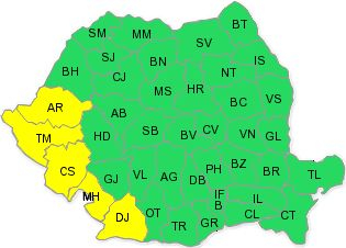 Între orele 10:00 și 18:00, în judeţele Arad, Timiş, Caraş-Severin, Mehedinţi şi Dolj vor fi averse, care vor avea şi caracter torenţial.