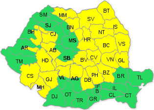 Al doilea cod galben este valabil de joi ora 06:00 până vineri la ora 12:00, când în estul şi sud-estul țării, precum și în toate zonele deluroase și montane, instabilitatea atmosferică se va menține accentuată și se va manifesta prin averse ce vor avea și caracter torențial, descărcări electrice, intensificări ale vântului şi izolat căderi de grindină. Cantitățile de apă vor depăși pe arii extinse 25 l/mp și izolat 60 … 70 l/mp.