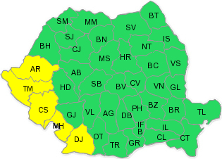Cod galben de ploi în Timiş, Caraş-Severin, Arad, Mehedinţi şi Dolj, până luni