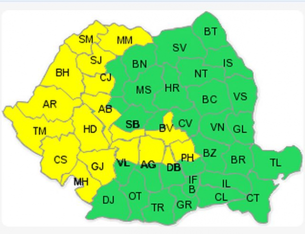 Un cod galben de ploi însemnate cantitativ, intensificări ale vântului, ninsori a fost emis vineri pentru 18 județe din vestul și centrul țării, informează Administrația Națională de Meteorologie. Atenționarea este valabilă în intervalul 30 ianuarie 2015, ora 17 – 31 ianuarie 2015, ora 10.