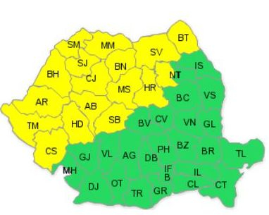 Codul se aplică pentru 17 județe din nordul, centrul și vestul țării, începând de duminică, ora 15:00, până luni, ora 18:00.![]()