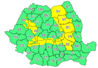 În intervalul menționat, în cea mai mare parte a zonei montane, local în Moldova și pe arii restrânse în nordul Munteniei vor fi averse, descărcări electrice, intensificări de scurtă durată ale vântului și izolat grindină.