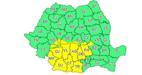 Iar până pe 11 august, ora 10:00, e în vigoare un cod galben de instabilitate atmosferică temporar accentuată în Oltenia, în nord-vestul Munteniei, precum și în zona Carpaților Meridionali. În aceste zone se vor semnala averse torențiale, descărcări electrice, intensificări ale vântului și pe alocuri vijelii și grindină. Cantitățile de apă vor depăși 25…35 l/mp și izolat 40…60 l/mp.