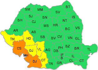 De asemenea, a fost emis cod galben de miercuri, ora 3:00, până vineri, ora 10:00, în județele Timiș, Hunedoara, Gorj, Vâlcea și Olt.