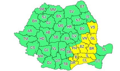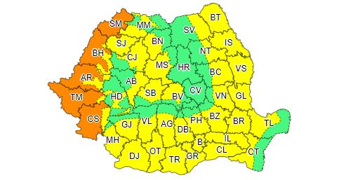 Tot în această zi e valabil un cod portocaliu de val de căldură în intensificare și disconfort termic accentuat, în zonele joase din vestul și nord-vestul țării. Temperaturile maxime se vor apropia de recordurile absolute ale datei. După-amiaza se vor înregistra frecvent valori de 36…38 de grade.