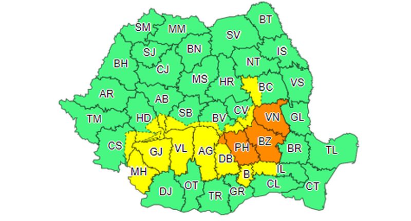 Iar codul portocaliu valabil de azi, de la ora 18.00, până mâine, la 22.00, vizează precipitații abundente în județele Prahova, Buzău, Vrancea și în zona montană județului Dâmbovița unde, prin acumulare, se vor înregistra cantități de apă, în general, de peste 50 – 60 de l/mp”, a mai explicat meteorologul Alexandra Roșioară, pentru B1 TV.