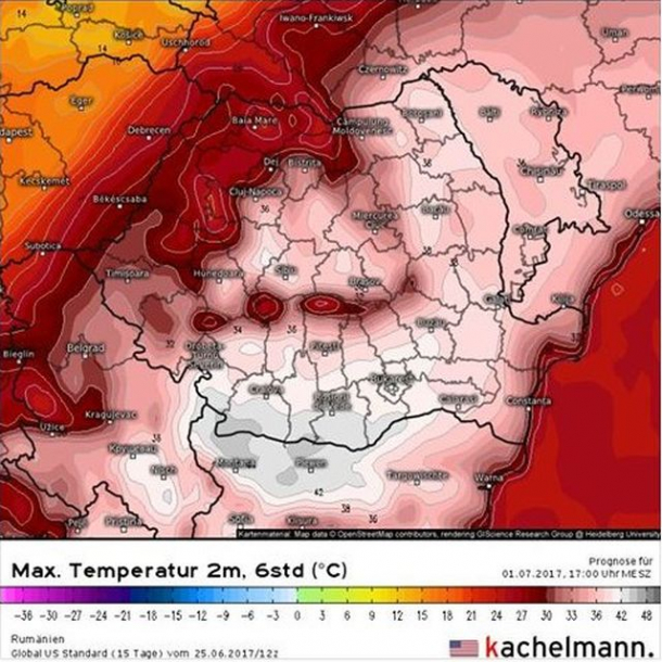 ECMWF arată pentru ziua de sâmbătă, 1 iulie, 45 de grade, scrie pe forumurile dedicate fenomenelor meteo.
