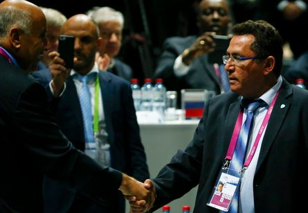 Președintele Federației palestiniene de fotbal, Djibril Rajoub, și Președintele Federației israelene de fotbal, Ofer Eini, au dat mâna după votul care a hotărât ca Israelul să nu fie suspendat.