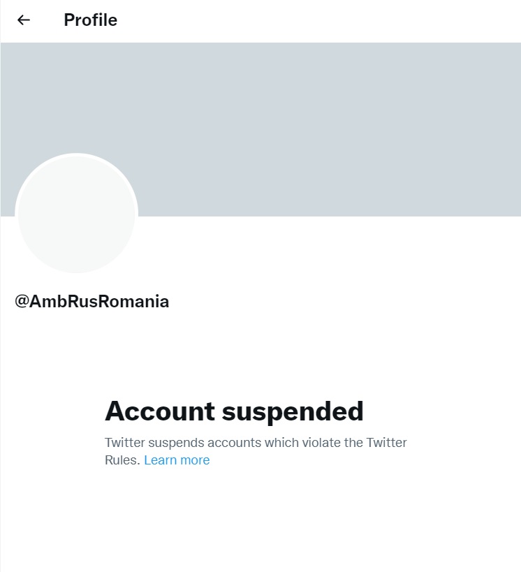 Twitter a suspendat contul ambasadei Rusiei în România și, în mesajul care apare acum când este accesat profilul respectiv, a precizat că ia astfel de decizii în cazul celor care încalcă regulile platformei.