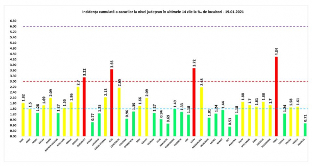 Județul Timiș înregistrează cea mai mare rată de infectare cu SARS-CoV-2, ajungând la 4.34 de îmbolnăviri la 1.000 de locutori. Imediat după, urmează județul Ilfov cu o rata de infectare de 3.72 și Cluj cu o incidență de 3.66.