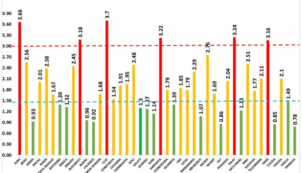 Potrivit celei mai recente informări a GCS, au depășit pragul de 3 cazuri COVID la mia de locuitori, în ultimele 14 zile, următoarele județele: Alba (3,66), București (3,18), Cluj, (3,7), Harghita (3,22), Sălaj (3,24) și Timiș (3,16).