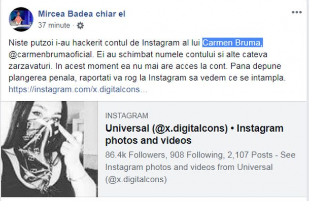 “Ei au schimbat numele contului si alte cateva zarzavaturi. In acest moment ea nu mai are acces la cont. Pana depune plangerea penala, raportati va rog la Instagram sa vedem ce se intampla”, a anunțat Mircea Badea pe rețelele de socializare.