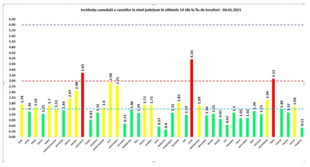 Astfel, la data de 4 ianuarie există doar două județe unde rata de incidență depășește trei bolnavi la 1.000 de locuitori și municipiul București. Județul cu cea mai mare rată a infectărilor este Ilfov, unde indicele este de 4.16. În Capitală, rata incidenței este de 3.43, în timp ce la Timiș de 3.12.