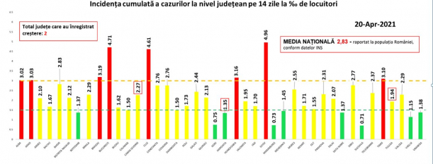 Coeficientul infectărilor cumulate la 14 zile, raportate la 1.000 de locuitori este calculat de către Direcțiile de Sănătate Publică, la nivelul Municipiului București și al județelor. Mai jos aveți graficul realizat în baza raportărilor primite de CNCCI de la Direcțiile de Sănătate Publică: