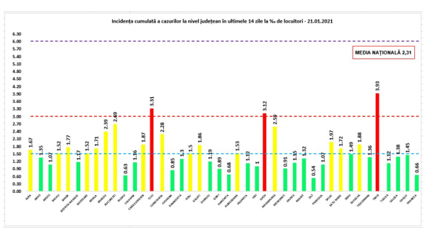 Coeficientul infectărilor cumulate la 14 zile, raportate la 1.000 de locuitori este calculat de către Direcțiile de Sănătate Publică, la nivelul Municipiului București și al județelor. Mai jos aveți graficul realizat în baza raportărilor primite de CNCCI de la Direcțiile de Sănătate Publică: