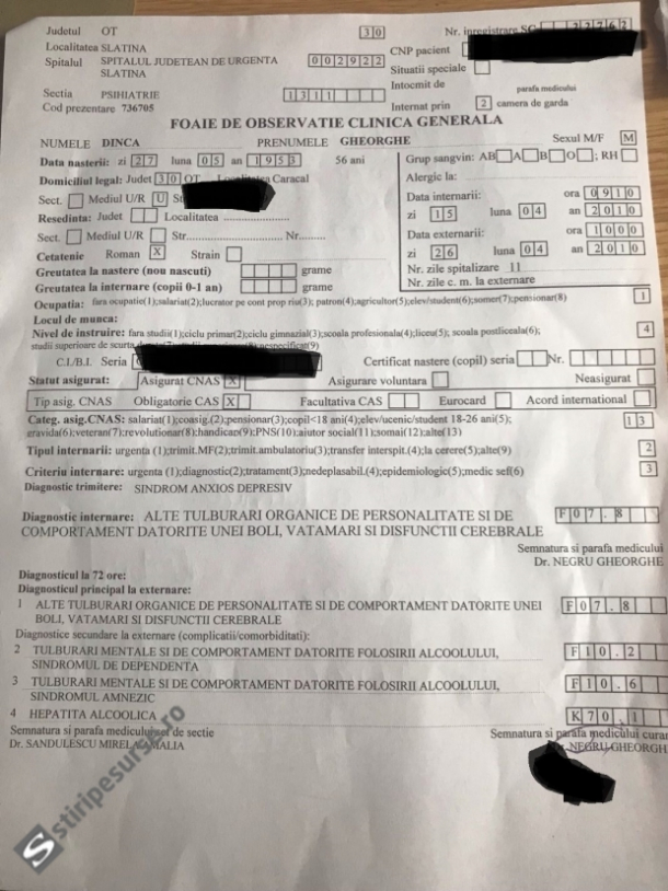 Între timp, a apărut și o foaie de observație din 2010, atunci când Gheorghe Dincă a fost internat la secția de psihiatrie a Spitalului Județea de Urgență Slatina.