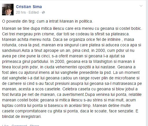 „La un moment dat, Vanghelie i-a dat lui Geoană cadou un Range Rover plin de microfoane şi de camere şi, cînd s-au făcut presiuni asupra lui Geoană să-l mătrăşească pe Marean, acesta a scos casetele. Celebra caseta cu Geoana şi blow jobul a fost livrată pe net de Marean, ca avertisment. După venirea lui Ponta, relaţiile lui Marean cu Costel Bobic, Geoană şi Mitică Iliescu s-au strâns şi mai mult: acum luptau contra lui Ponta şi Băsescu, în acelaşi timp. Marean deţine multe casete compromiţătoare cu Ghiță şi Ponta. Dacă le scoate, face senzaţie. E blindat de înregistrari“, mai scrie Sima.