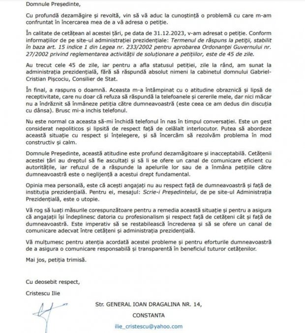 Considerând că a așteptat destul, după 45 de zile fără niciun răspuns de la Administrația Prezidențială, constănțeanul a revenit cu o scrisoare în care a cerut lămuriri.