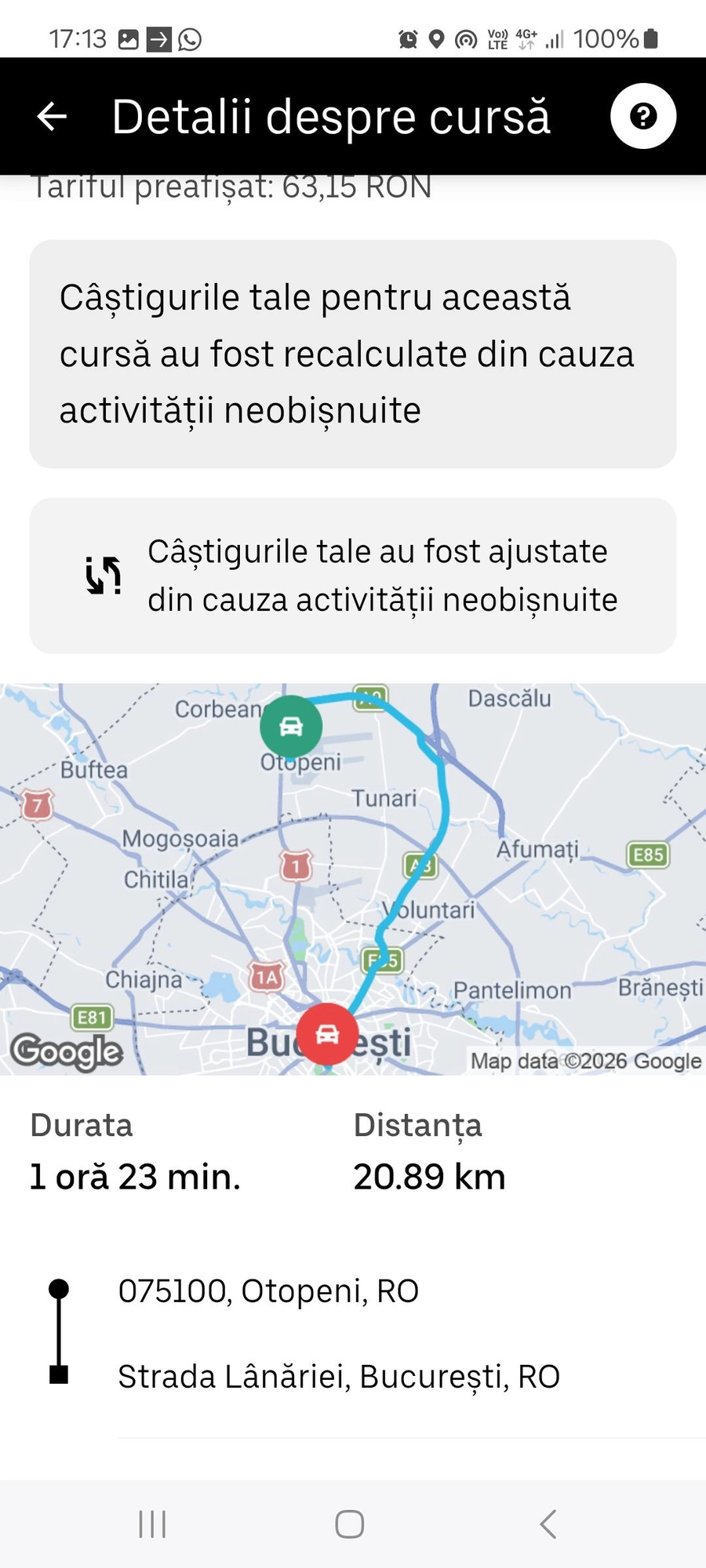 Un exemplu recent a aprins spiritele. O cursă de 1 oră și 23 de minute, pe traseul București – Aeroportul Otopeni, a fost tarifată la doar 63,15 lei. Șoferul, vizibil surprins, a explicat pe un grup de Facebook că a parcurs aproximativ 36 de kilometri, inclusiv pe A0. Traseul a fost chiar modificat la sugestia pasagerului, lucru care, în mod normal, ar fi trebuit să influențeze costul final.
