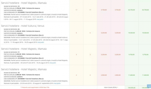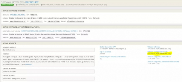 Un caz cel puţin ciudat îl avem la Direcţia Generală pentru Asistenţă Socială şi Protecţia Copilului Sector 6. Aici, instituţia a scos prin procedură de cumpărare directă un contract, în valoare de 22.095,95 de euro, prin care 30 de angajaţi urmau să fie trimişi la malul mării la două hoteluri din Mamaia şi Venus. Această procedură a fost încheiată pe 12 iulie.