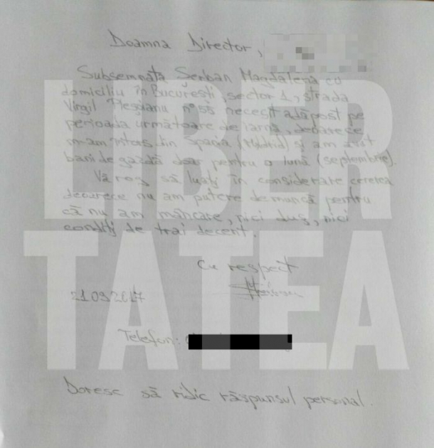 ”Necesit adăpost pe perioada următoare de iarnă, deoarece m-am întors din Spania (Madrid) și am avut bani de gazdă doar pentru o lună. Vă rog să luați în considerare cererea deoarece nu am putere de muncă pentru că nu am mâncare, nici duș, nici condiții de trai decent”, spunea Magdalena Șerban, în cererea adresată, potrivit Libertatea.