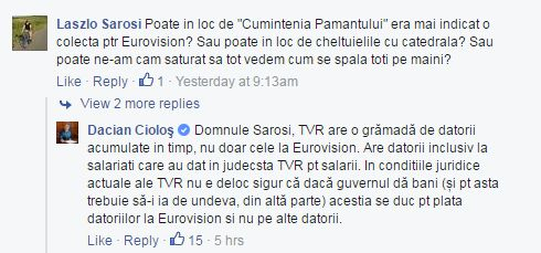 "Domnule Sarosi, TVR are o grămadă de datorii acumulate in timp, nu doar cele la Eurovision. Are datorii inclusiv la salariati care au dat in judecsta TVR pt salarii. In conditiile juridice actuale ale TVR nu e deloc sigur că dacă guvernul dă bani (și pt asta trebuie să-i ia de undeva, din altă parte) acestia se duc pt plata datoriilor la Eurovision si nu pe alte datorii", a răspuns Dacian Cioloș.