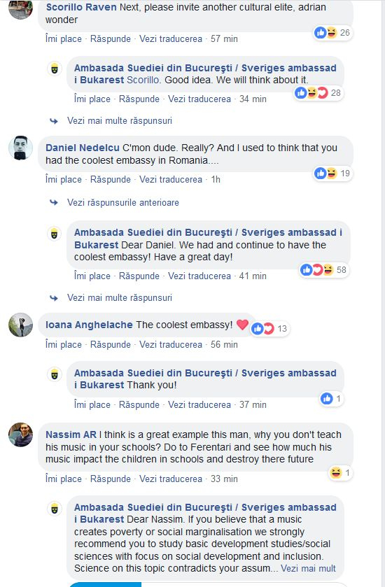 Alți români critică în termeni duri primirea manelistului la Ambasada Suediei: “vad suficient de multi manelisti peste tot, urmaream ambasada suediei ca sa vad altfel de valori promovate. Unlike”