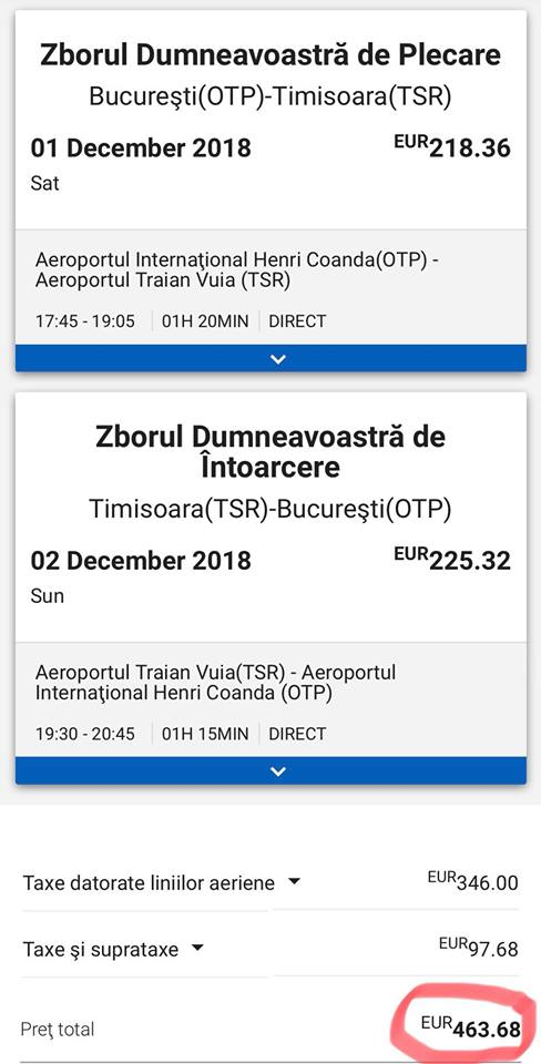 „Cu privire la informațiile apărute în spațiul public despre prețurile biletelor TAROM pentru cursa București – Timișoara și retur, facem următoarea precizare: un bilet dus-întors, pentru o persoană, în perioada 1-2 decembrie a.c. poate fi achiziționat cu suma de 79,42 euro (cu toate taxele aferente, inclusiv bagaj de cală dus-întors).