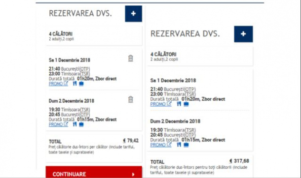 Prim urmare, un grup de 4 persoane (2 adulți și 2 copii) în perioada 1- 2 decembrie a.c., dus întors, se poate îmbarca într-o cursă TAROM contra sumei de minim 317,68 euro.