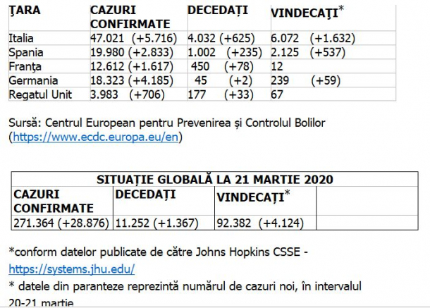 În continuare vă prezentăm situația privind infectarea cu virusul COVID – 19 (coronavirus) la nivel european și global: