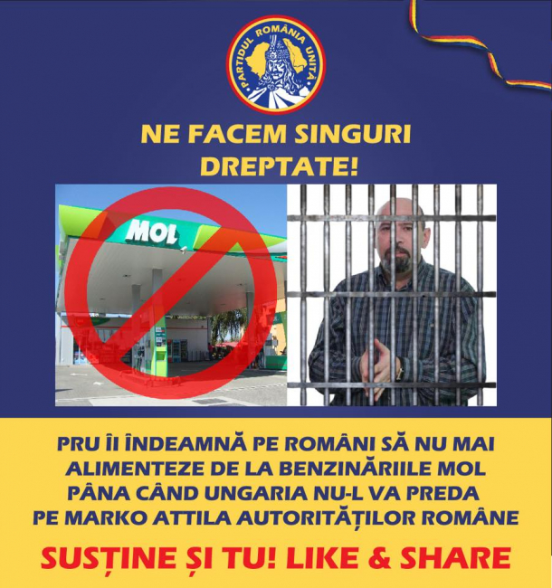 Vizate sunt și benzinăriile MOL: “PRU îi îndemană pe români să nu mai alimenteze de la benzinăriile MOL până când Ungaria nu-l va preda pe Marko Attila autorităților române”, este mesajul lui Diaconu.