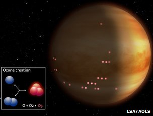 Naveta European Space Agency’s Venus Express a surprins stratul de ozon în timp ce observa stelele din atmosfera planetei Venus. Stelele îndepărtate erau pale din cauza stratului de ozon care obsoarbe lumina ultravioletă.