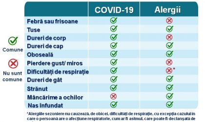 Un grafic postat pe pagina de Facebook a RO Vaccinare surprinde asemănările și diferențele dintre alergii și COVID-19. Dacă aveți simptome, discutați cu medicul dumneavoastră. Este posibil să aveți nevoie de un test COVID-19 pentru a vă confirma diagnosticul.