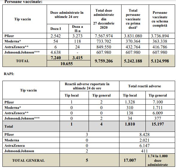Comitetul Național de Coordonare a Activităților privind Vaccinarea împotriva COVID-19 (CNCAV) a anunțat că, în ultima zi, au fost vaccinate 10.655 de persoane, din care 7.240 cu prima doză. În total, până acum au fost vaccinate 5.242.188 de persoane, din care 5.124.998 au schema de imunizare completă.