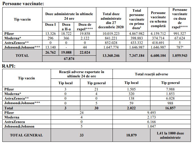 13.360.246 de doze au fost administrate în total, fiind înregistrate 18.879 de reacții adverse. Dintre aceste, 191 sunt în curs de investigare.