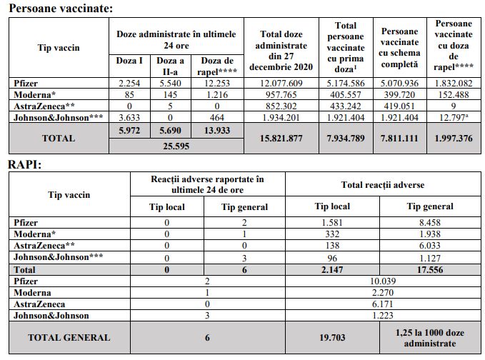 De la debutul campaniei de imunizare au fost vaccinate 7.934.789 de persoane, din care 7.811.111 au schema de vaccinare completă, iar 1.997.376 au și a treia doză administrată.