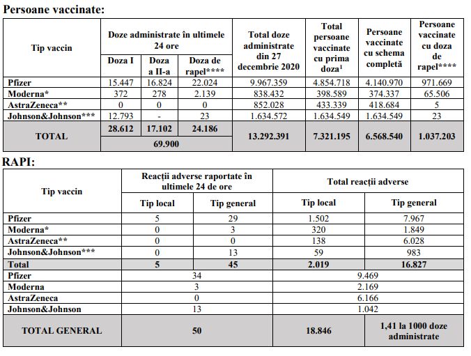 Datele CNCAV arată că în ultima zi au fost vaccinate anti-COVID 69.900 de persoane, din care 28.612 au primit prima doză, 17.102 au primit-o pe a doua și 24.186 pe a treia. Au fost raportate 50 de reacții adverse.