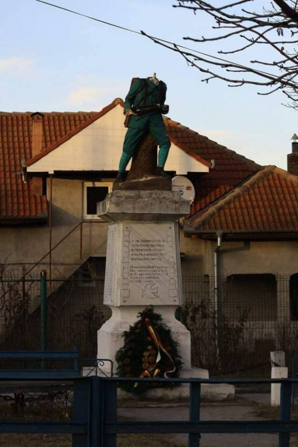 Statuia din centrul localităţii doljene Terpeziţa a fost vandalizată acum două luni. Soldatul nemuritor a rămas fără cap, situația nu a fost remediată, iar făptașul n-a fost prins, iar autoritățile spun că nu au unde să depună coroane de flori decât acolo.